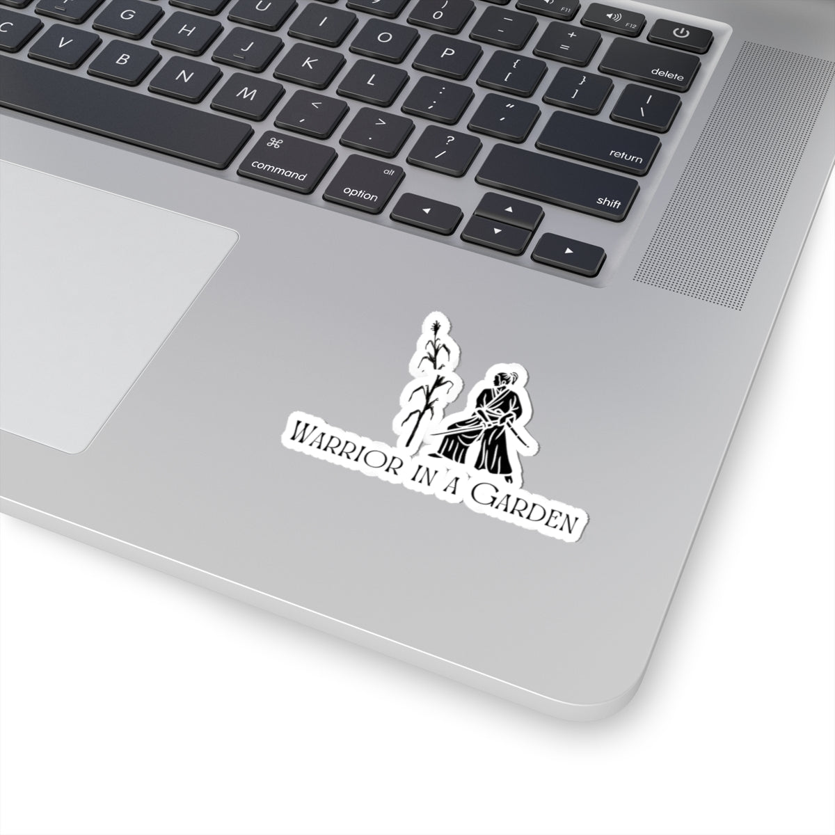 A glossy kiss-cut sticker of the Warrior in a Garden emblem—a samurai cutting through a cornstalk with effortless precision. Durable, detailed vinyl perfect for your laptop, water bottle, or gym gear.
